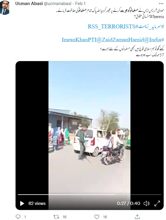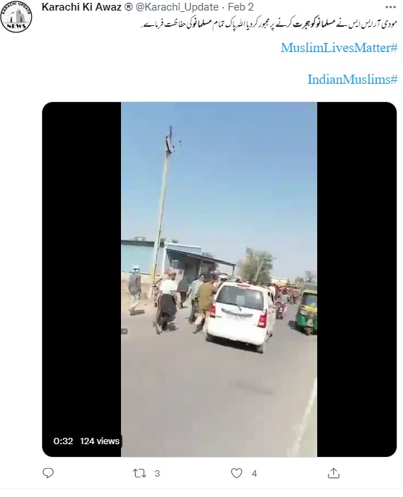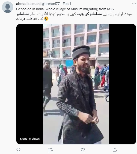 فیس بک ہر ایک صارف نے مذکورہ ویڈیو کے کیپشن میں لکھا ہے کہ “بھارتی ریاست گجرات میں آر ایس ایس کے سینکڑوں دہشت گردوں کے گاؤں میں اترنے کے بعد مسلمانوں کا ایک پورا گاؤں اپنے گھروں سے ہجرت کرنے پر مجبور ہے۔ یہ مسلمان اپنی جان اور عزت کے لیے بھاگ رہے ہیں کیونکہ ان کی تمام جائیدادیں ضبط ہو چکی ہیں..”۔