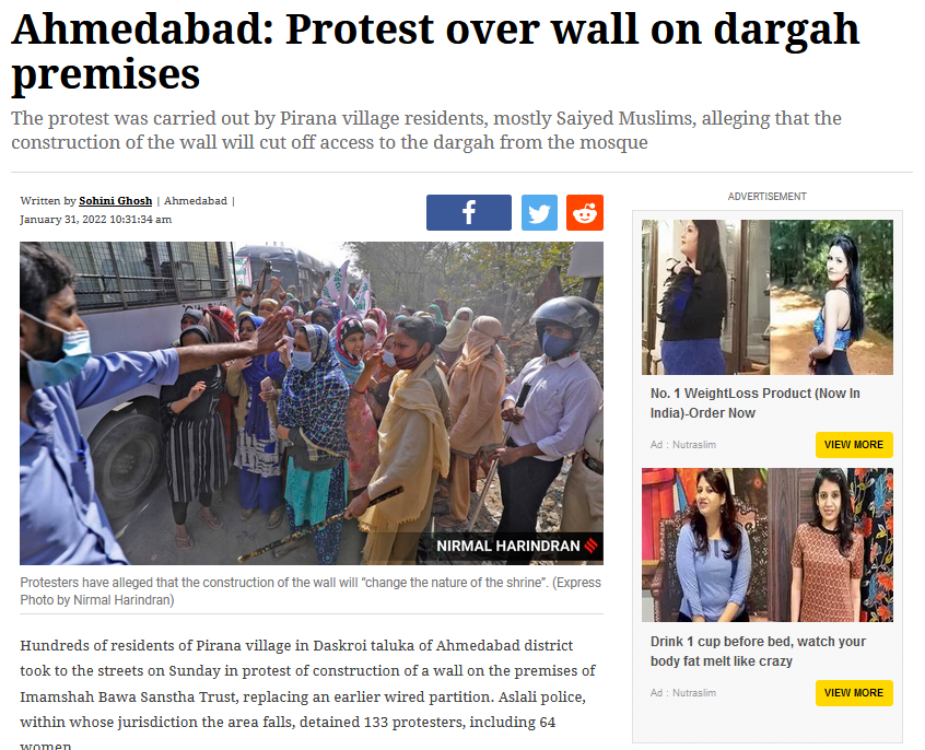گجرات کے پیرانہ کے مسلمانوں کے ہجرت کرنے سے متعلق وائرل ویڈیو کی سچائی جاننے کے لئے ہم نے اپنی ابتدائی تحقیقات کا آغاز کیا۔ سب سے پہلے ہم نے گوگل پر پیرانہ درگاہ معاملے سے متعلق کچھ کیورڈ سرچ کیا۔ اس دوران ہمیں انڈین ایکسپریس اور احمد آباد میرر پر شائع 31 جنوری 2022 کی رپورٹس ملیں۔ جس کے مطابق ڈسکروئی تعلقہ کے پیرانہ گاؤں کے رہنے والے سیکڑوں لوگ امام شاہ باوا سنستھا ٹرسٹ کے احاطے میں بن رہی دیوار کے خلاف احتجاج کرنے سڑکوں پر اتر آئے تھے۔