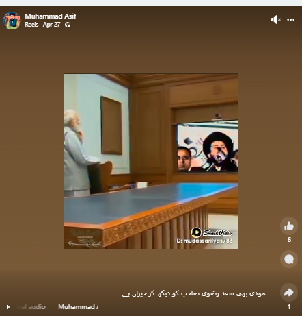 صارف نے ویڈیو کے ساتھ کیپشن میں لکھا ہے “شیر تو وہ کہ جب للکارے تو کفر بھی لرز جائے، نریندر مودی بھی، سعد رضوی صاحب کو دیکھ کر حیران ہے”۔