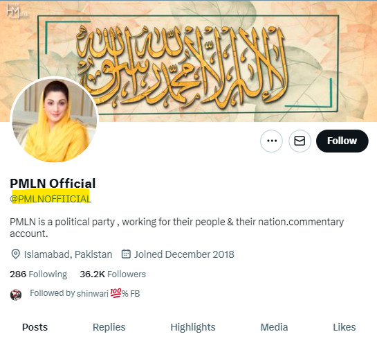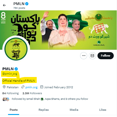 ہم نے پی ایم ایل این کے اصل ایکس ہینڈل کو دیکھا تو معلوم ہوا کہ جس پی ایم ایل این آفیشل نامی ایکس ہینڈل سے لیٹر شیئر کیا گیا ہے وہ دراصل فرضی ہینڈل ہے، جبکہ پی ایم ایل این کے اصل ہینڈل پر 2.5 ملین فالوورس ہیں اور یہ فروری 2012 سے موجود ہے۔