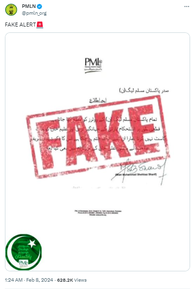 پھر ہم نے اصل پی ایم ایل این کے ہینڈل کو اسکرال کرکے دیکھا تو ہمیں ہوبہو لیٹر ملا، جس میں اسے فرضی بتایا گیا ہے۔ ان کی جانب سے اتحاد ختم کرنے کا کوئی بھی الرٹ جاری نہیں کیا گیا ہے۔