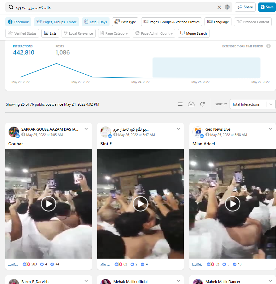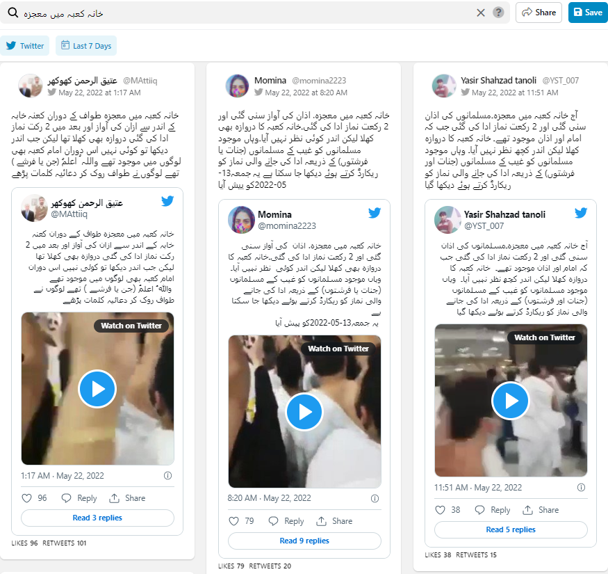 فیس بک پر خانہ کعبہ میں جنات اور فرشتوں کی امامت میں ادا کی گئی نماز کے حوالے سے شیئر کی گئی ویڈیو کو کتنے صارفین نے پوسٹ کیا ہے، یہ جاننے کے لئے ہم نے کراؤڈ ٹینگل پر کیورڈ سرچ کیا تو ہمیں پتا چلا کہ اس موضوع پر پچھلے 3 دنوں میں 1,086 پوسٹ شیئر کئے گئے ہیں اور 442،810 فیس بک صارفین نے اس موضوع پر تبادلہ خیال کیا ہے۔ جبکہ ٹویٹر پر بھی کئی صارفین نے اس ویڈیو کو شیئر کیا ہے۔
