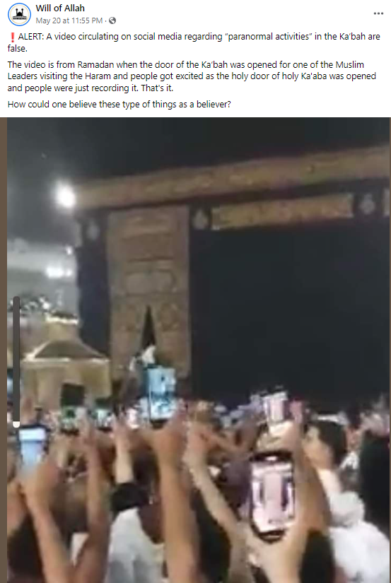 خانہ کعبہ میں جنات اور فرشتوں کی امامت میں ادا کی گئی نماز کے حوالے سے وائرل خبر کی سچائی جاننے کے لئے ہم نے کچھ کیورڈ سرچ کیا۔ اس دوران ہمیں ول آف اللہ نامی فیس بک پیج پر ایک پوسٹ ملا۔ جس میں وائرل ویڈیو کے ساتھ کئے گئے دعوے کے حوالے سے لکھا ہے کہ ،الرٹ: خانہ کعبہ میں “غیر معمولی سرگرمیوں” کے حوالے سے سوشل میڈیا پر گردش کرنے والی ویڈیو غلط ہے۔ یہ ویڈیو رمضان المبارک کی ہے جب حرم میں آنے والے ایک مسلم رہنما کے لیے خانہ کعبہ کا دروازہ کھولا گیا تھا۔ کعبہ کا مقدس دروازہ کھلتے ہی لوگ پرجوش ہو گئے اور لوگ ان کی ریکارڈنگ کرنے لگے تھے۔ ایک مؤمن کی حیثیت سے کوئی اس قسم کی باتوں پر کیسے یقین کر سکتا ہے؟