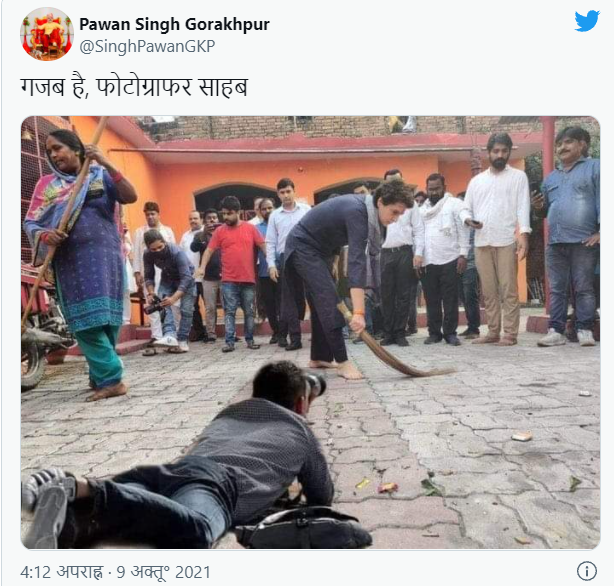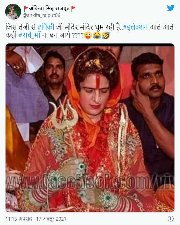 سوشل میڈیا پر کانگریس لیڈر پرینکا گاندھی کی دو مختلف تصاویر وائرل ہو رہی ہے۔ پہلی تصویر میں پرینکا گاندھی لال ساڑی میں نظر آ رہی ہیں اور ان کے ہاتھ میں تریشول بھی ہے۔ ان کی پیشانی پر بڑا سا ٹیکا لگا ہے۔ اس تصویر پر لوگ طنز کر رہے ہیں کہ “جس تیزی سے پنکی جی مندر مندر گھوم رہی ہیں، انتخاب آتے آتے کہیں رادھے ماں نہ بن جائیں”۔ وہیں دوسری تصویر میں “پرینکا گاندھی جھاڑو لگاتی نظر آرہی ہیں اور ایک فوٹوگرافر زمین پر لیٹ کر ان کی تصویر کلک کرتا ہوا نظر آرہا ہے”۔