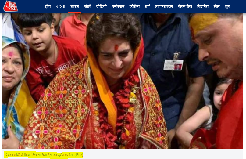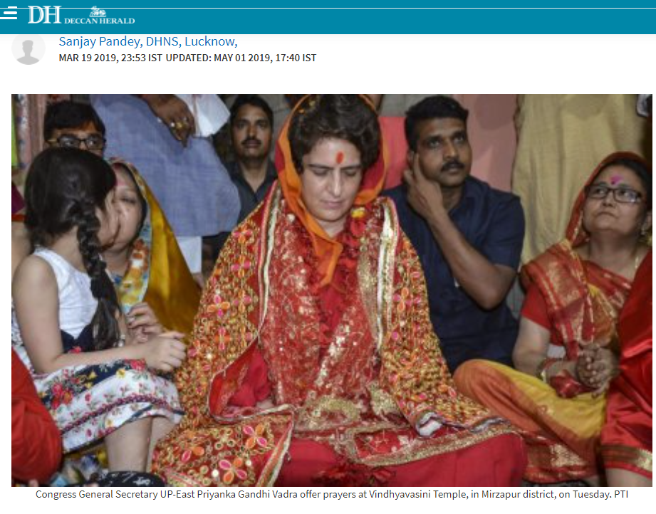 پڑتال کے دوران ہمیں دکن ہیرالڈ پر شائع ایک رپورٹ ملی۔جس کے مطابق پرینکا گاندھی کی وائرل تصویر ودھیانچل مندر کی زیارت کی ہے۔ جسے فوٹوشاپ کی مدد سے ایڈیٹ کر کے مذکورہ دعوے کے ساتھ شیئر کیا جا رہا ہے۔