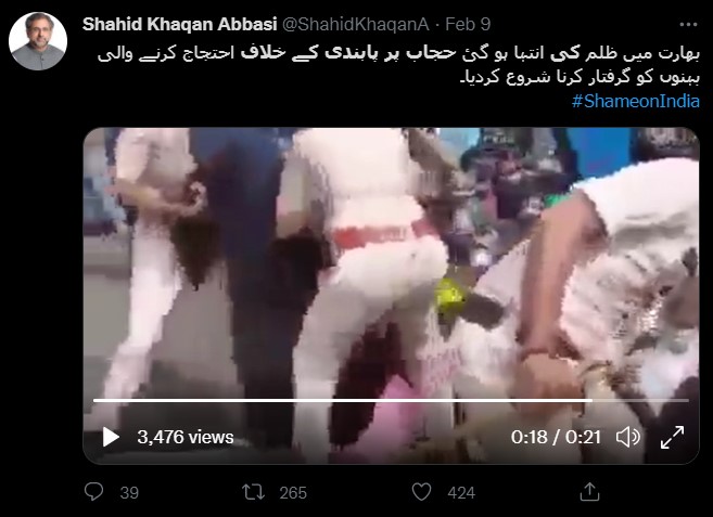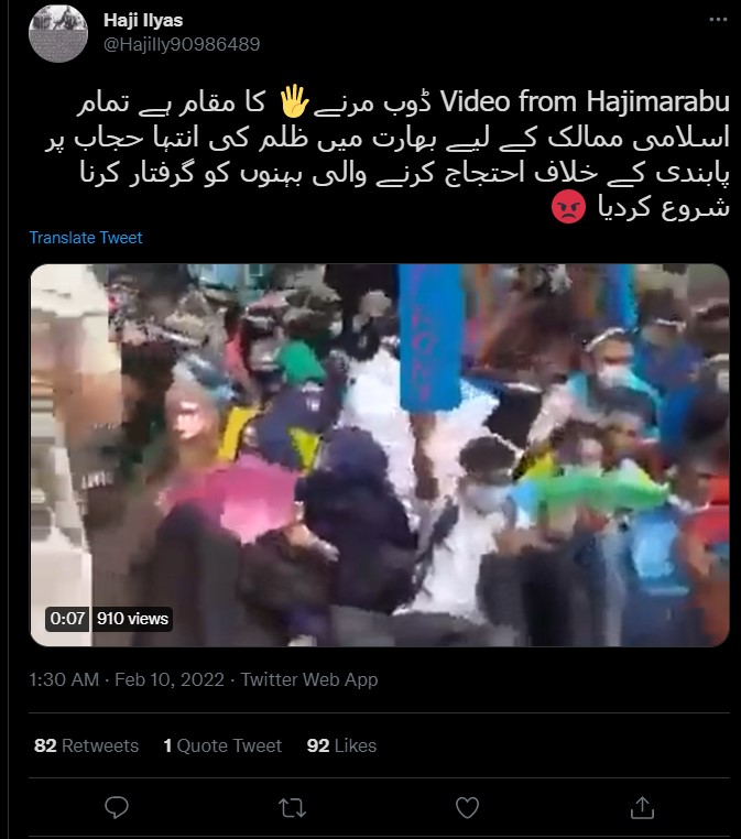 ٹویٹر پر ایک صارف نے وائرل ویڈیو کے کیپشن میں لکھا ہے کہ “ڈوب مرنے کا مقام ہے تمام اسلامی ممالک کے لیے بھارت میں ظلم کی انتہا، حجاب پر پابندی کے خلاف احتجاج کرنے والی بہنوں کو گرفتار کرنا شروع کر دیا گیا ہے”۔