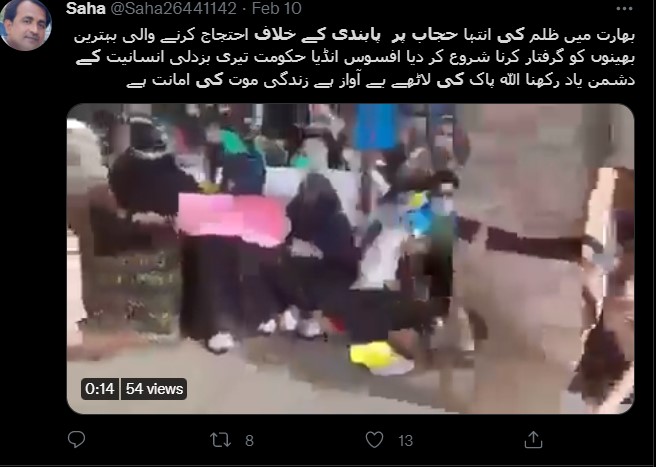 کرناٹک میں طلبہ کے حجاب پہننے کو لے کر تنازعہ چھڑا ہوا ہے۔ حجاب کی حمایت میں ملک بھر میں احتجاج اور جلوس نکال رہے ہیں۔ ای ٹی وی بھارت کے مطابق کولکاتا کی عالیہ یونیورسٹی کی طالبات نے حجاب کی حمایت میں احتجاجی مظاہرہ اور جلوس نکالا۔ وہیں دوسری جانب اسی کے پیش نظر ایک ویڈیو وائرل ہو رہا ہے، جس میں پولس احتجاج کر رہے مرد و خواتین پر لاٹھی چارج کر رہی ہے اور انہیں اٹھا کر لے جا رہی ہے۔ صارفین کا دعویٰ ہے کہ بھارت میں حجاب پر پابندی کے خلاف احتجاج کر رہی مسلم خواتین کو گرفتار کیا جا رہا ہے، لیکن اس پر مسلم ممالک خاموش تماشائی بنے ہوئے ہیں۔