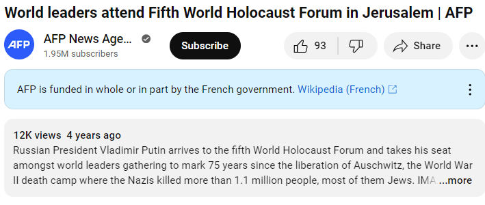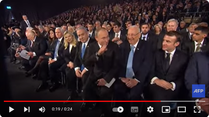 یہ ویڈیو 2020 میں روسی صدر پوتن کے یروشلم میں منعقد ہونے والے پانچویں عالمی ہولوکاسٹ فورم کے ہال میں پہنچے کی ہے۔ اس موقع پر دونوں ممالک کے صدور نے ایک دوسرے سے کئی بار ملاقات بھی کی تھی۔