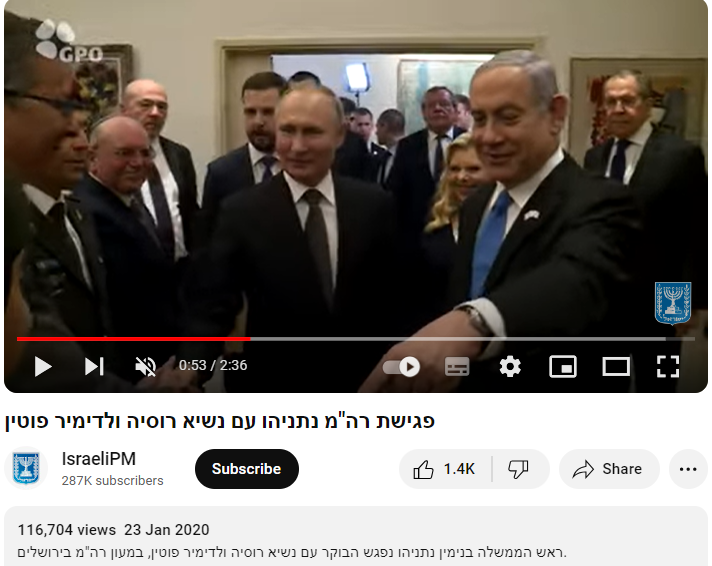 اس کے علاوہ 23 جنوری 2020 کو اپلوڈ شدہ مذکورہ پروگرام کی ایک اور ویڈیو اسرائیل پی ایم نامی یوٹیوب چینل پر بھی موصول ہوئی۔ جس میں واضح طور پر دیکھا جا سکتا ہے کہ روسی صدر پوتن اسرائیلی صدر نتن یاہو سے ہاتھ ملا کر گلے لگ رہے ہیں۔ یہاں یہ بھی دعویٰ جھوٹا ثابت ہوا کہ روسی صدر نے اسرائیلی صدر کو بھری محفل میں نظر انداز کیا۔ اس حوالے سے مزید تفصیلات ایسو سی ایٹ پریس، ٹائمس آف اسرائیل اور یاد واشم نامی ویب سائٹس پر پڑھی جا سکتی ہیں۔