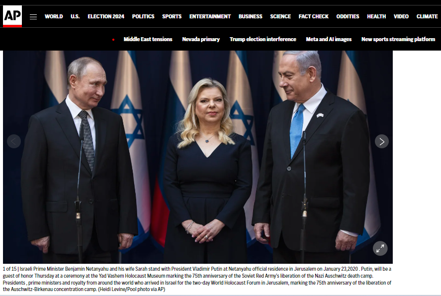 سوشل میڈیا پر ایک پروگرام کی ویڈیو شیئر کی گئی، جس میں روسی صدر ولادیمیر پوتن اور اسرائیلی صدر نتن یاہو کے حوالے سے دعوی کیا گیا کہ روسی صدر پوتن نے بھری محفل میں اسرائیلی صدر کو نظر انداز کیا اور ان سے مصافحہ کرنے سے انکار کردیا۔ بتادوں کہ ویڈیو میں فرانس سمیت دیگر یہودی ممالک کے صدور کو بھی دیکھا جا سکتا ہے۔