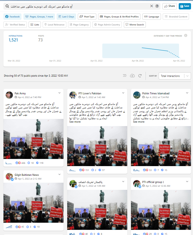 فیس بک پر مذکورہ دعوے کے ساتھ والی تصویر کو کتنے صارفین نے شیئر کیا ہے، یہ جاننے کے لئے ہم نے کراؤڈ ٹینگل پر کیورڈ سرچ کیا تو ہمیں پتا چلا کہ اس موضوع پر پچھلے 3 دنوں میں 73 پوسٹ شیئر کئے گئے ہیں اور 1,521 فیس بک صارفین نے اس موضوع پر تبادلہ خیال کیا ہے۔ جبکہ ٹویٹر پر بھی اسی پوسٹر والی تصویر کو ماسکو میں پاکستانی پی ایم عمران خان اور روسی صدر ولادیمیر پوتن سے جوڑ کر شیئر کیا گیا ہے۔