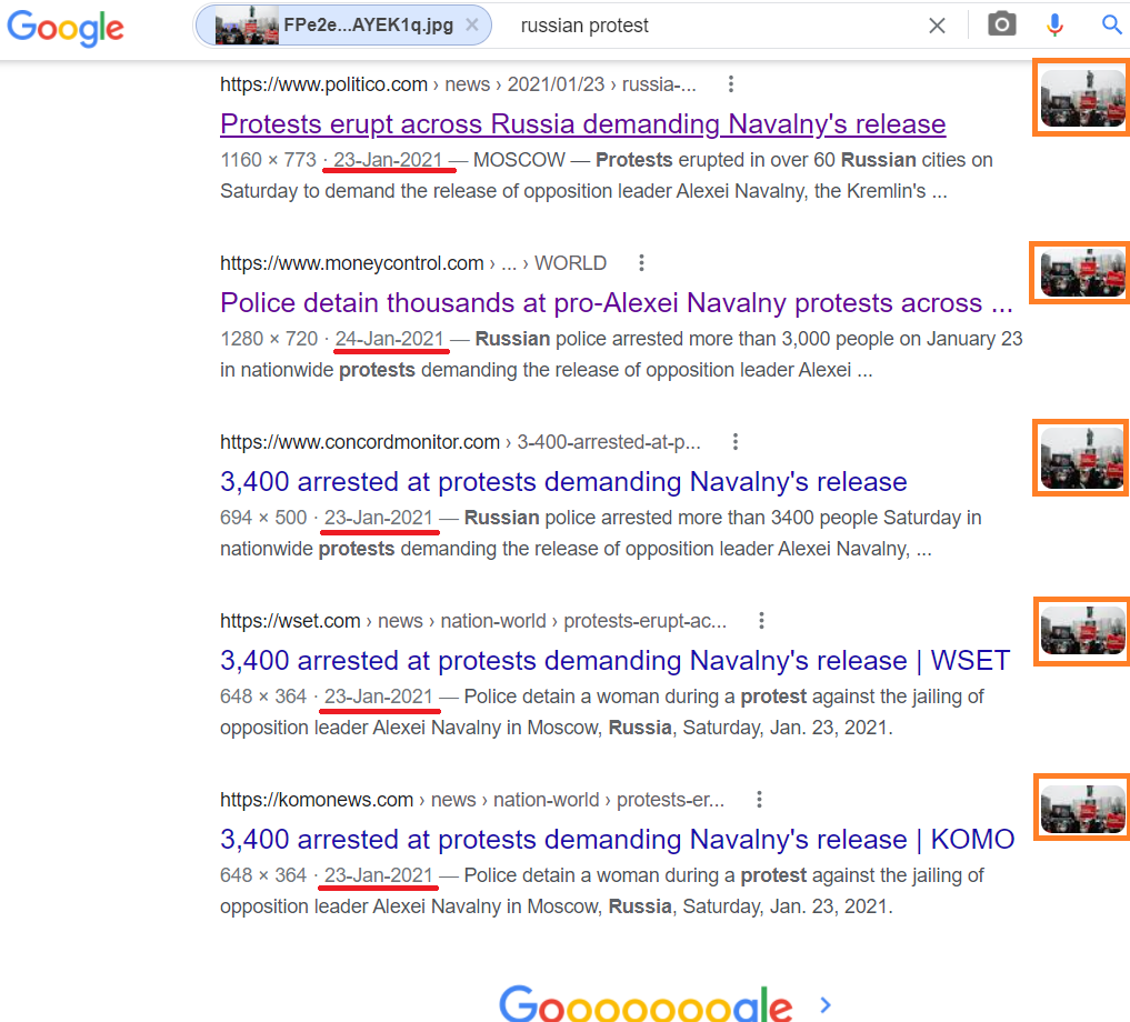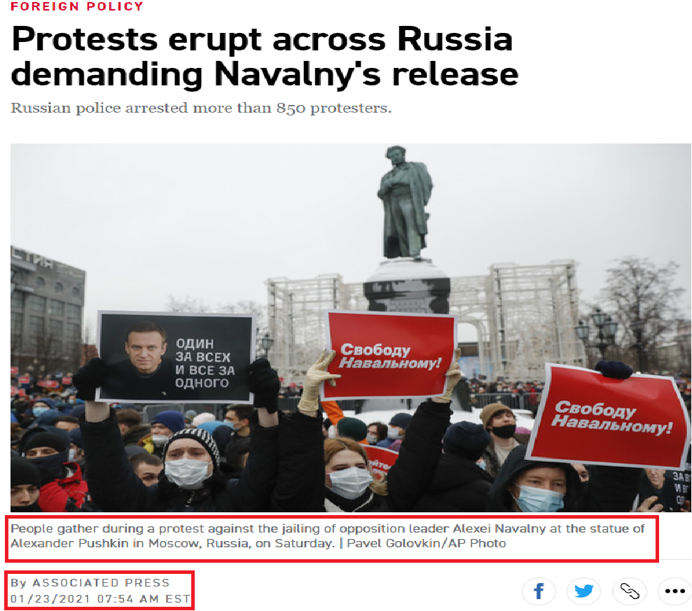 پولیٹیکو ڈاٹ کام نے تصویر کے کیپشن میں ایسوسی ایٹ پریس کے حوالے سے لکھا ہے کہ “بروز سنیچر(23 جنوری 2021) روس کی دارالحکومت ماسکو میں الیگزینڈر پشکن کے مجسمے کے ارد گرد اپوزیشن رہنما الیکسی ناویلنی کو جیل بھیجنے کے خلاف احتجاج کے دوران جمع ہوئے لوگوں کی یہ تصویر ہے”۔ لیک اس رپورٹ میں ماسکو میں پاکستانی پی ایم کا ذکر نہیں ہے۔