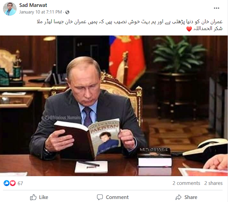 سوشل میڈیا پر روسی صدر پوتین کی عمران خان پر لکھی گئی کتاب پڑھتے ہوئے ایک تصویر وائرل ہورہی ہے۔ کتاب کے کور پیج پر عمران خان کی تصویر بنی ہے اور اس پر انگلش میں ‘عمران خان پاکستان’ لکھا ہوا ہے۔ صارفین کا دعویٰ ہے کہ عمران خان جیسے لیڈر کی کتاب دنیا پڑھنا چاہتی ہے۔