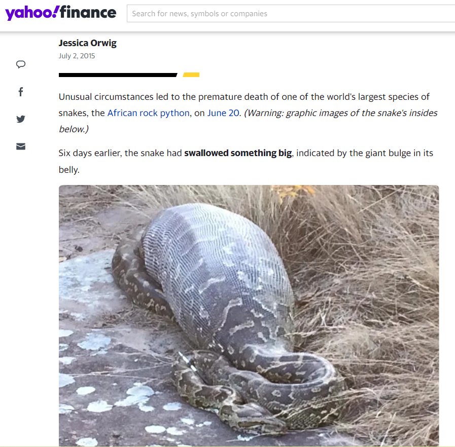 اب ہم نے جب تصویر کے ساتھ شائع خبر کو غور سے پڑھا تو پتہ چلا کہ جنوبی افریقہ کے ایلین گیم ریزرب میں پورکیوپائن(ساہی،خارپشت والا جانور)کو اژدہے نے کھا لیا تھا، یہ اسی کی تصویر ہے، رپورٹ میں یہ بھی واضح کیا گیا ہے کہ اژدہے کو دیکھنے گئی لوگوں کی بھیڑ کے ڈر سے اژدہے کی موت بھی ہوگئی تھی۔ اب یہاں واضح ہوا گیا کہ یہ تصویر انڈونیشیا میں زندہ خاتون کو نگلنے والے اژدہے کی نہیں ہے۔