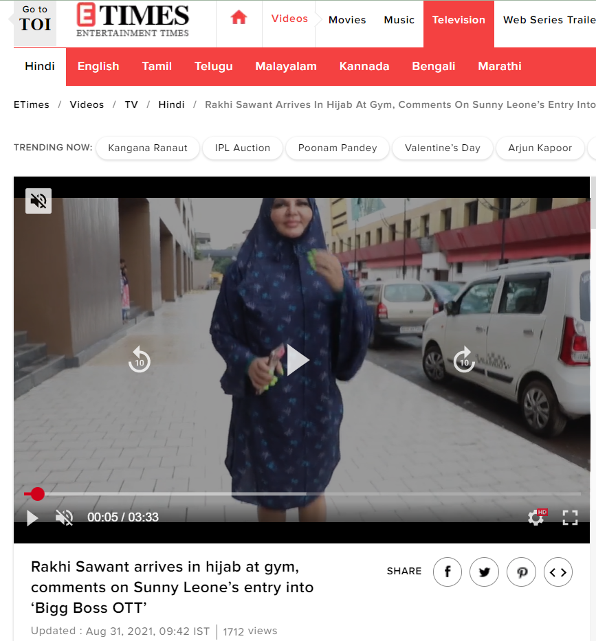 گوگل کیورڈ سرچ کے دوران ہمیں ٹائمس آف انڈیا پر شائع 30 اگست 2021 کی ایک ویڈیو رپورٹ ملی۔ جس کے مطابق راکھی ساونت کی یہ ویڈیو جم میں داخل ہو نے کی ہے۔ اس دوران راکھی نے میڈیا سے بات چیت کے دوران سنی لیونی پر تبادلہ خیال کیا تھا۔