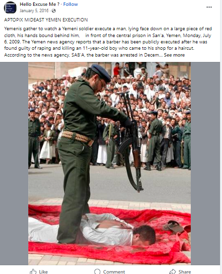 یمن میں نابالغ بچی کی عصمت ریزی کے جرم میں سرعام موت کی سزا دینے کا بتاکر شیئر کی گئی تصویر کو ہم نے گوگل لینس پر سرچ کیا۔ جہاں ہمیں 5 جنوری 2016 کو شیئر شدہ ہیلو ایکسکیوز می نامی فیس بک پیج پر ہوبہو تصویر ملی۔ جس میں اس تصویر کے حوالے سے لکھا ہے کہ یمن میں 11 سالہ لڑکے کو زیادتی کے بعد قتل کرنے کے جرم میں ایک حجام کو سرعام یمن کے صنعاء میں سزائے موت دی گئی۔