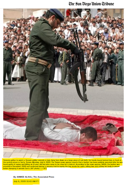 آر ٹی ای اردو نامی مستند ایکس صارف نے تصویر کے ساتھ کیپشن میں لکھا ہے کہ “یمن میں تین سالہ بچی کو زیادتی کا نشانہ بنانے اور بعد میں قتل کرنے والے کو سرعام مجمع میں گولی کے ساتھ موت کے گھاٹ اتار دیا گیا”۔