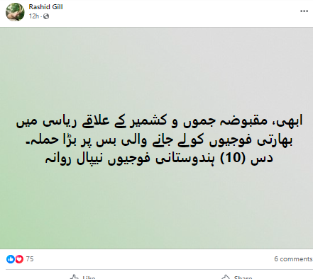 سوشل نٹورکنگ سائٹ ایکس پر صارف نے ایک تصویر شیئر کی، جس میں کچھ فوجی ایک بس کا معائنہ کرتے ہوئے نظر آ رہے ہیں۔ تصویر کے ساتھ صارف کا دعویٰ ہے کہ جموں و کشمیر کے ریاسی میں بھارتی فوجیوں کی بس پر دہشت گردانہ حملہ ہوا ہے۔ ساتھ ہی کیپشن میں یہ بھی لکھا ہے کہ “مقامی پولیس نے دس (10) ہندوستانی فوجیوں کی ہلاکت کی تصدیق کی ہے”۔