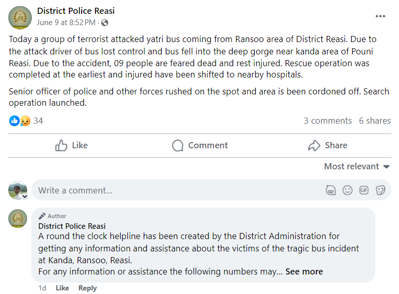 ریاسی ضلع پولس نے بھی سوشل میڈیا پر اس بات کی تصدیق کی ہے کہ دہشت گرد حملہ ایک ‘مسافر بس’ پر کیا گیا تھا۔ پولس نے فیس بک پوسٹ میں لکھا ہے کہ “حملے کی وجہ سے، بس کنٹرول کھو بیٹھی اور پونی ریاسی کے کنڈا علاقے کے قریب گہری کھائی میں گر گئی”۔