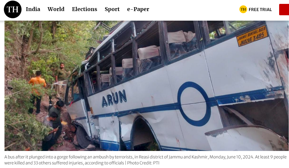 جموں و کشمیر کے ریاسی دہشت گردانہ حملے میں فوجی بس میں سوار دس(10) بھارتی فوجی ہلاک۔
