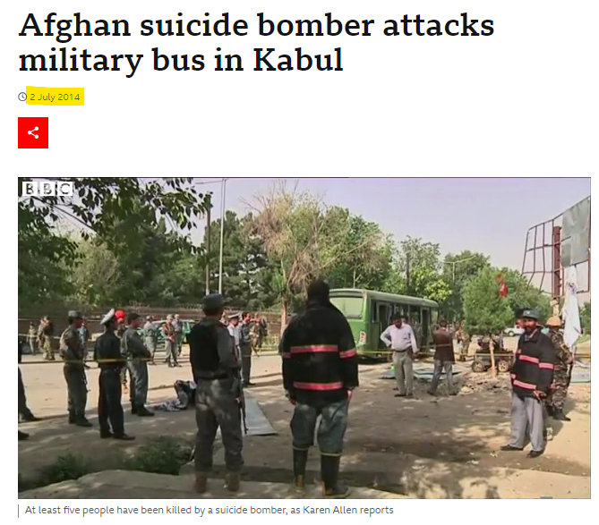 مزید سرچ کے دوران اسی تصویر کے ساتھ 2 جولائی 2014 کو شائع بی بی سی کی بھی ایک رپورٹ موصول ہوئی۔ جس میں وزارت دفاع کے ترجمان جنرل ظاہر عظیمی کے بیان کے حوالے سے لکھا ہے کہ”آج صبح کابل میں اے این اے (افغان نیشنل آرمی) کی فضائیہ کی بس پر ہوئے خودکش حملے میں فوج کے 8 اہلکار شہید اور 13 زخمی ہو گئے”۔