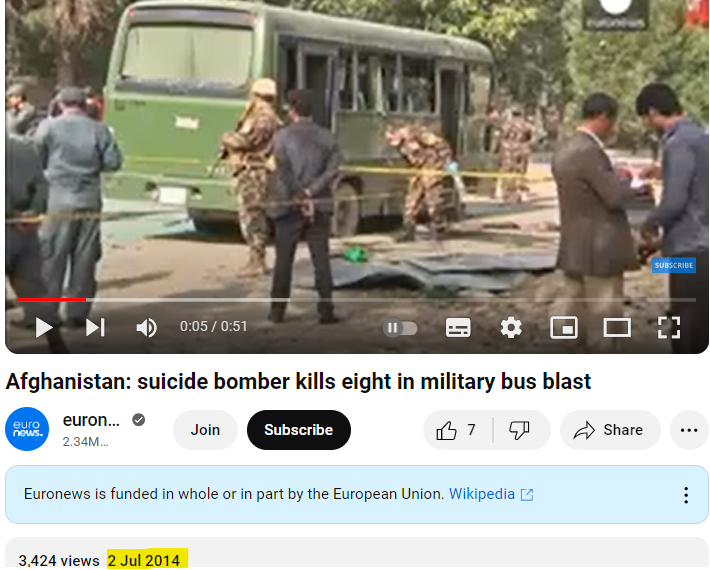 وائرل دعوے کے ساتھ شیئر کی گئی تصویر کو گوگل لینس پر سرچ کیا۔ جہاں ہمیں 2 جولائی 2014 کو شائع شدہ یورو نیوز کی ویڈیو رپورٹ ملی۔ اس رپورٹ میں بھی اسی تصویر کا استعمال کیا گیا ہے۔ رپورٹ کے مطابق “افغانستان کے کابل میں ایک فوجی بس پر ہوئے خودکش حملے میں کم از کم آٹھ افراد ہلاک اور 13 دیگر افراد زخمی ہو گئے۔ دھماکہ دارالحکومت کی یونیورسٹی کے قریب شہر کے ایک انتہائی محفوظ علاقے میں ہوا۔ طالبان نے اس حملے میں ملوث ہونے کا اعتراف کیا ہے”۔