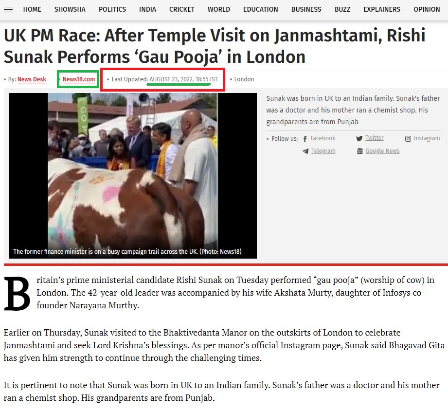 ویڈیو کے ساتھ دی گئی معلومات کے مطابق رشی سوناک نے اپنی اہلیہ اکشتا مرتھی کے ساتھ لندن میں گائے پوجا کی ۔اس کے علاوہ ہمیں نیوز18 کی ویب سائٹ پر رشی سوناک کی گائے کی پوجا کے حوالے سے 23 اگست 2022 کی ایک رپورٹ ملی۔ جس کے مطابق رشی سوناک نے الیکشن کیمپئنگ کے دوران اپنی اہلیہ اکشتا مرتھی کے ساتھ لندن کے بھکتی ویدانتا منور مندر میں جن ماشٹمی کے موقع پر دورہ کیا تھا۔