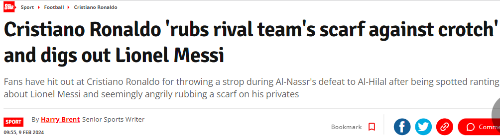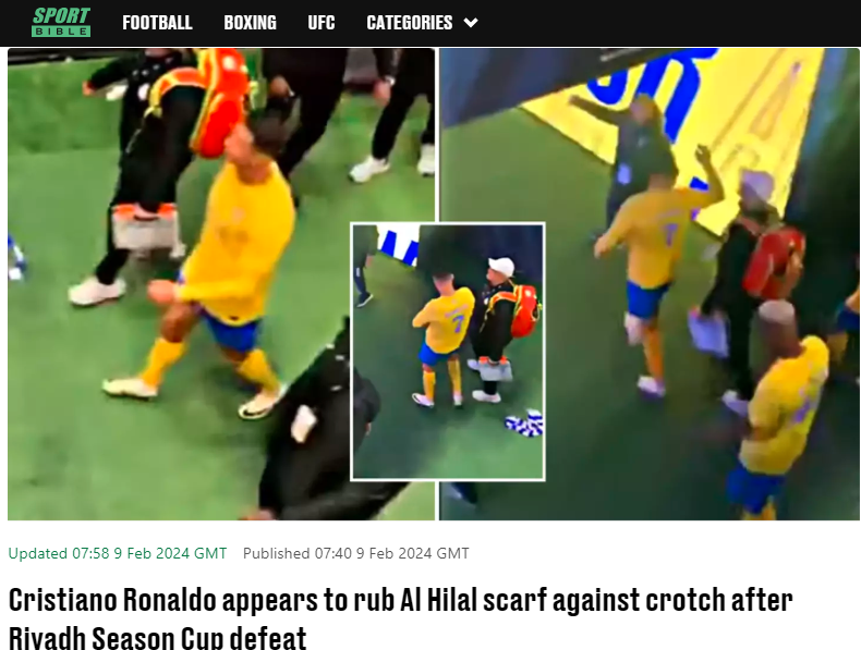 ہم نے وائرل ویڈیو کے ایک فریم کو گوگل ریورس امیج سرچ کیا تو ہمیں اسپورٹ بائیبل، ڈیلی اسٹار اور ای ایس پی این نیوز ویب سائٹس پر 9 فروری 2024 کو شائع شدہ وائرل ویڈیو سے متعلق رپورٹس موصول ہوئیں۔ ان رپورٹس کے مطابق مداحوں نے کرسٹیانو رونالڈو پر النصر کی الہلال سے شکست کے دوران اسکارف پھینکا تھا، جسے رونالڈو نے مخصوص اعضاء سے لگاکر پھینک دیا تھا۔