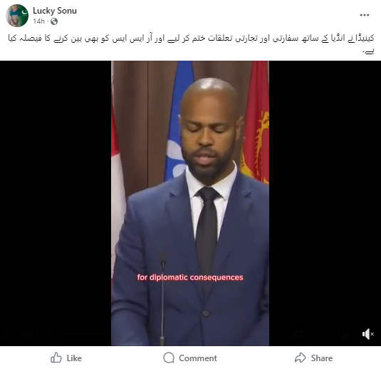ہندوستان-کینیڈا کے حالیہ سفارتی کشیدگی کے درمیان ایک ویڈیو سوشل میڈیا پر وائرل ہو رہا ہے۔ وائرل ہونے والے دعوے میں کہا جا رہا ہے کہ “کینیڈا کی حکومت نے ہندوتوا تنظیم راشٹریہ سویم سیوک سنگھ (آر ایس ایس) پر پابندی لگا دی ہے اور کینیڈا نے انڈیا کے ساتھ سفارتی اور تجارتی تعلقات بھی ختم کر لیا ہے”۔ یہ دعویٰ ایک ویڈیو کے ساتھ وائرل ہوا ہے جس میں ایک شخص کینیڈا میں آر ایس ایس پر پابندی سمیت تین مطالبات کر رہا ہے۔