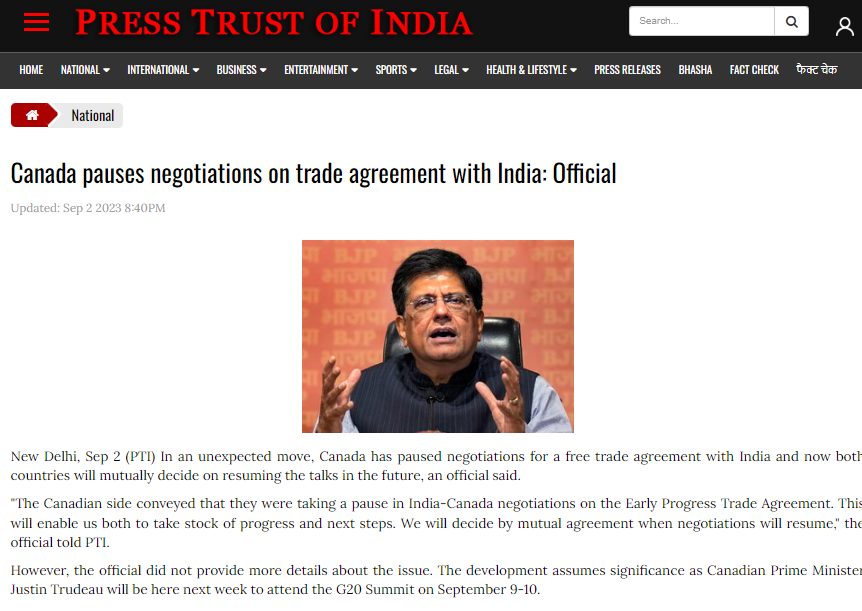 وائرل ویڈیو کے ساتھ کئے گئے دعوے کی سچائی جاننے کے لئے ہم نے سب سے پہلے گوگل پر “کینیڈا نے انڈیا کے ساتھ سفارتی و تجارتی تعلقات ختم کر لیا” کیوڑد سرچ کیا۔ جہاں ہمیں پریس ٹرسٹ آف انڈیا کی ویب سائٹ پر 2 ستمبر کی ایک رپورٹ ملی۔ پی ٹی آئی کے مطابق کینیڈا نے بھارت کے ساتھ تجارتی مشن عارضی طور پر ملتوی کردیا ہے۔ اس کے علاوہ سفارتی تعلقات میں تلخی کے حوالے سے سرکاری بیان یہاں اور یہاں پڑھ سکتے ہیں۔