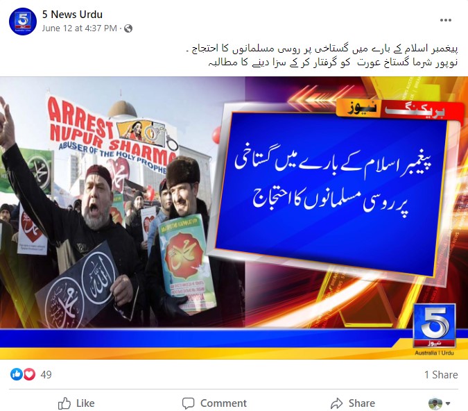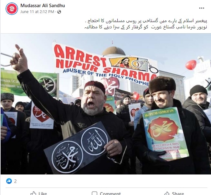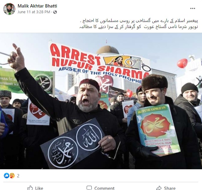 روس اردو نامی ٹویٹر ہینڈل سے ایک تصویر شیئر کر دعویٰ کیا جا رہا ہے کہ روسی مسلمانوں نے نوپور شرما کے خلاف احتجاج بلند کیا ہے۔ تصویر میں ایک پوسٹر صاف طور ہر دیکھا جا سکتا ہے۔ جس پر نوپور شرما کی گرفتاری کی بات لکھی ہے۔