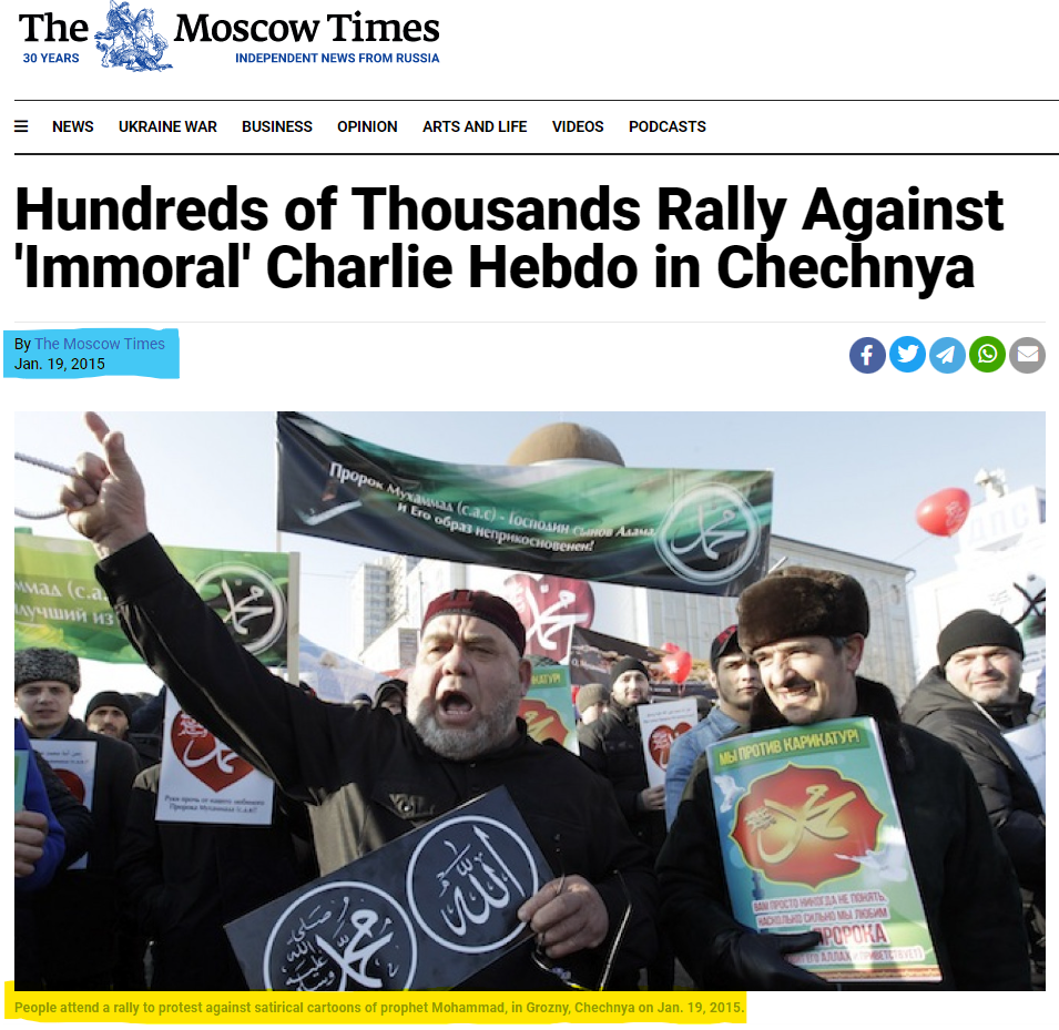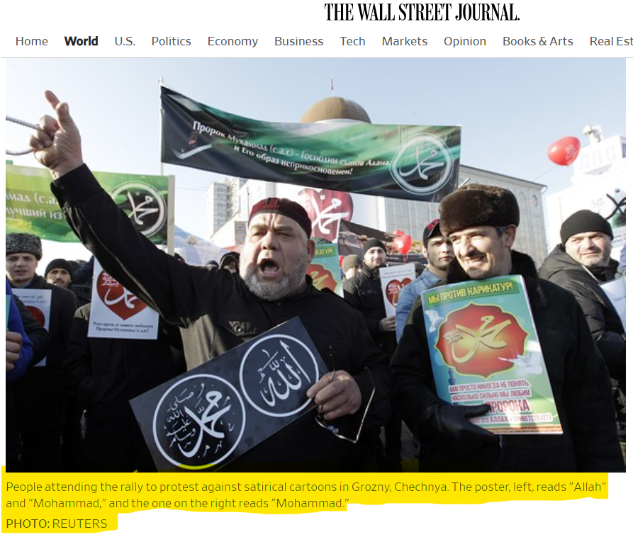 گوگل ریورس امیج سرچ کے دوران ہمیں دی وال اسٹریٹ جنرل نامی ویب سائٹ پر 19 جنوری 2015 کی رپورٹ میں شائع ہو بہو وائرل تصویر ملی۔ تصویر کے کیپشن میں رائٹرز کے حوالے سے لکھا ہے کہ یہ تصویر “گروزنی، چیچنیا میں لوگوں نے حضورﷺ کا طنزیہ خاکہ بنائے جانے کے خلاف ہوئی ریلی میں شرکت کی”۔