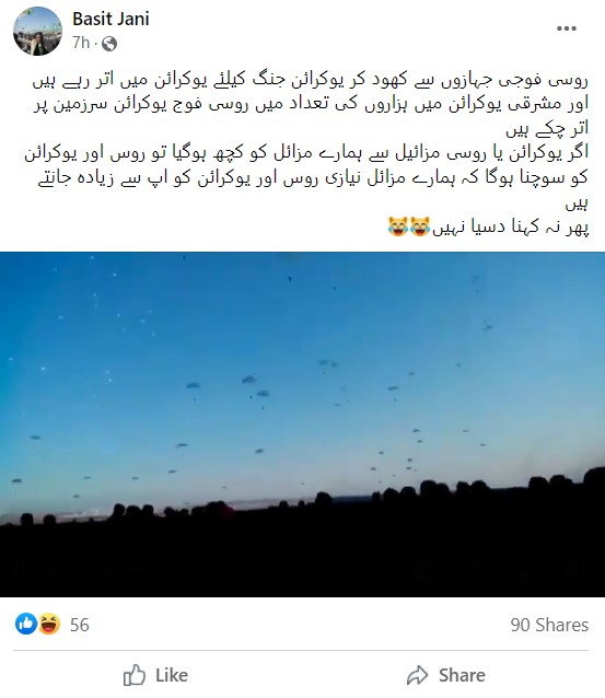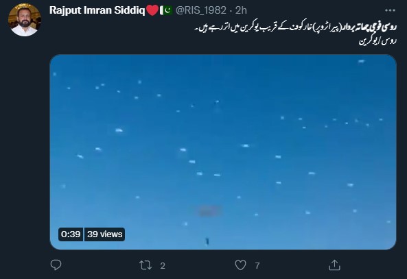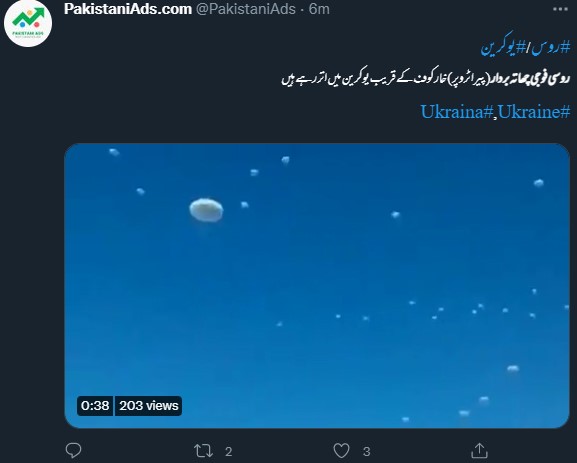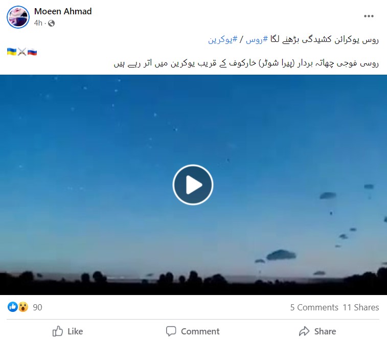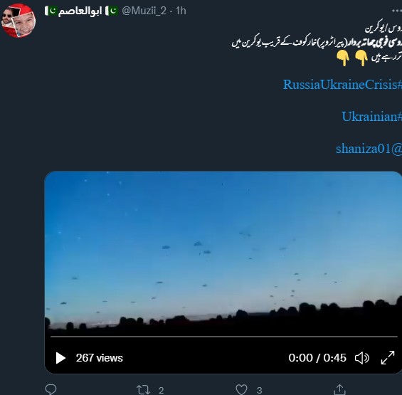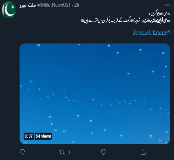 فیس بک اور ٹویٹ پر بھی دیگر صارفین ویڈیو کو روس کی جانب سے یوکرین میں پیرا ٹروپرس کے ذریعے فوجی اتارنے کا بتاکر شیئر کر رہے ہیں۔