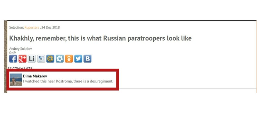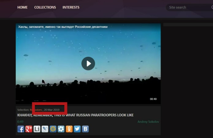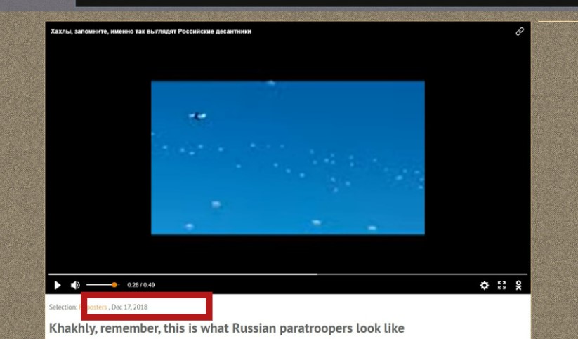 مذکورہ ویب سائٹ پر پیرا ٹروپرس والی وائرل ویڈیو 17 دسمبر 2018 کو روسی کیپشن کے ساتھ شائع کی گئی ہے۔ ترجمہ کرنے پر پتا چلا کہ اس میں دکھا رہ ہیں کہ روسی پیراٹروپرس کیسے نظر آتے ہیں۔