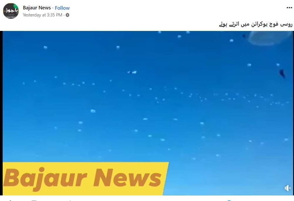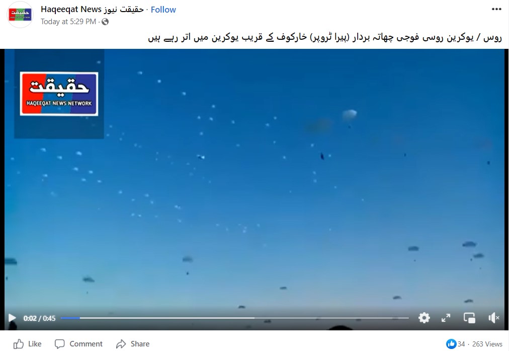 سوشل میڈیا پر پیرا ٹروپرس سے اتر رہے لوگوں کی ایک ویڈیو شیئر کی جا رہی ہے۔ ویڈیو کے کیپشن میں صارف نے لکھا ہے کہ “روسی فوج پیرا شوٹ خارکوف کے قریب یوکرین میں اتر رہے ہیں”۔