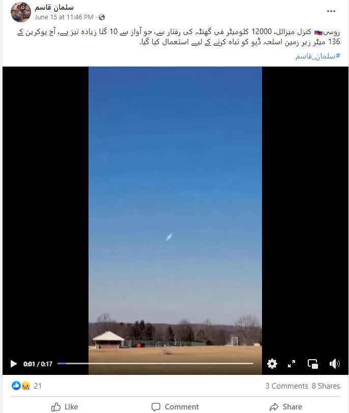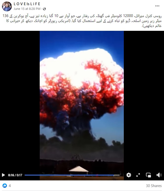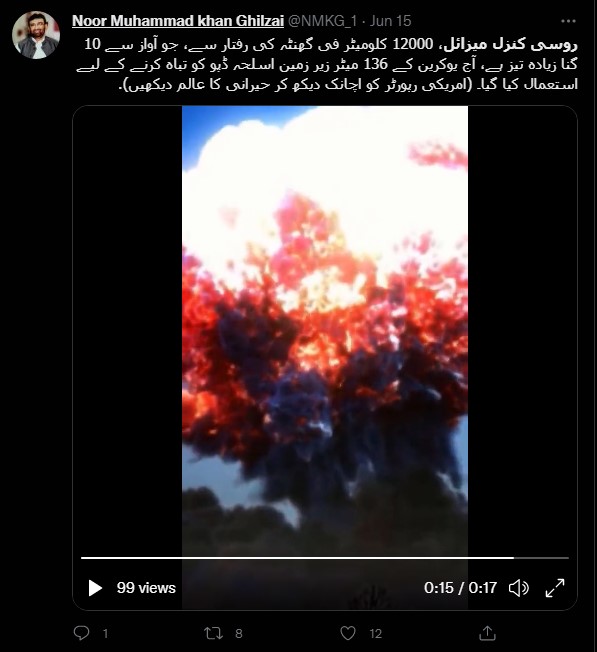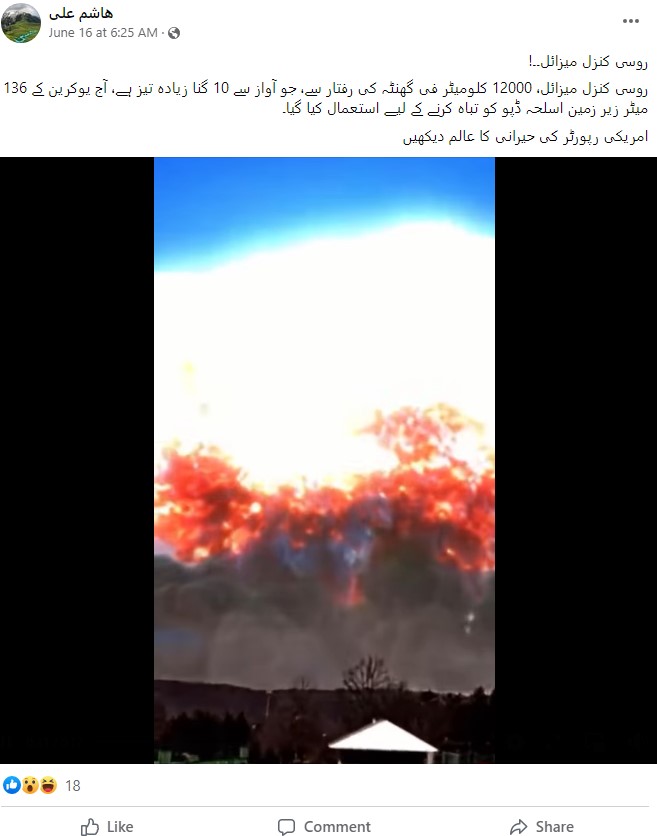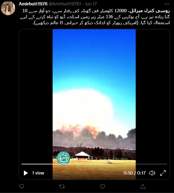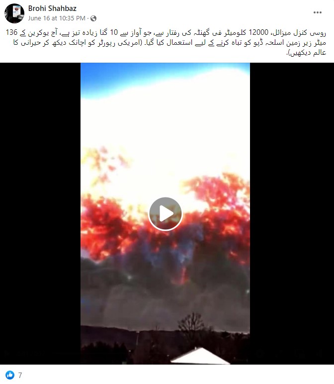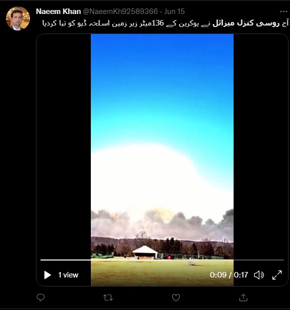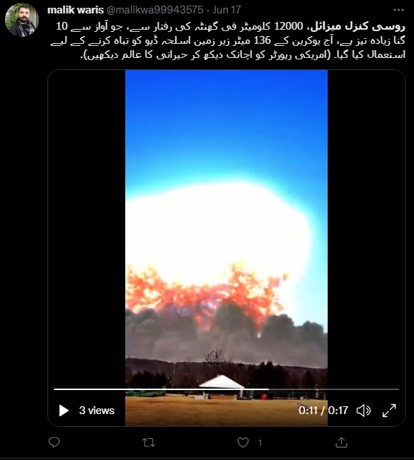 یوکرین پر روسی میزائل حملے کا بتاکر ایک ویڈیو سوشل میڈیا پر شیئر کی جا رہی ہے۔ جس میں میزائل نما چیز گرنے کے بعد بڑا دھماکہ ہوتے ہوئے دیکھا جا سکتا ہے۔ ویڈیو سے متعلق صارف کا دعویٰ ہے کہ روس نے اپنے کنز میزائل سے یوکرین کے 136 میٹر زمین کے نیچے بنے اسلحہ ڈیپو پر حملہ کیا ہے۔