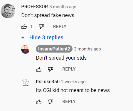اس ویڈیو کے ساتھ دیئے گئے ڈسکرپشن سے پتا چلا کہ یہ اسی طرح کے ویڈیوز وی ایف ایکس کی مدد سے بناتے ہیں، ڈسکرپشن میں ان کے ذریعے استعمال کئے گئے سافٹ ویئر کی بھی جانکاری دی گئی ہے۔ ان کے چینل پر اسی طرح کی مزید ویڈیوز موجود تھیں۔ وائرل ہونے والی ویڈیو کے کمنٹ سیکشن کو کھنگالنے پر ہمیں ایک کمنٹ نظر آیا جس میں لکھا ہے کہ”فرضی خبر مت پھیلاؤ”۔ جس کے جواب میں لکھا ہے کہ یہ ایک کمپیوٹر جنریٹڈ ایمج ہے نہ کہ فرضٰ خبر۔