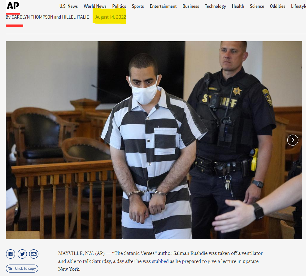 بھارتی نژاد برطانوی ادیب سلمان رشدی کی موت کی خبر میں کتنی سچائی ہے؟ یہ جاننے کے لئے ہم نے کچھ کیورڈ سرچ کیا۔ اس دوران ہمیں الجزیرہ ڈاٹ کام اور ایسوسی ایٹ پریس کی ویب سائٹ پر شائع 14 اگست 2022 کی رپورٹس ملیں۔ ان رپورٹس کے مطابق سلمان رشدی کی طبعیت میں اب کافی سدھار ہوا ہے۔ انہیں سنیچر کو وینٹیلیٹر سے ہٹا دیا گیا ہے اور اب وہ بات کرنے کی بھی حالت میں ہیں۔ وہ ابھی بھی بازو اور جگر میں زیادہ زخم ہونے کہ وجہ سے اسپتال میں زیر علاج رہیں گے۔ رشدی کو حملے کے بعد ہیلی کاپٹر سے قریبی اسپتال میں لے جایا گیا تھا، جہاں ان کی وقتی طور پر سرجری کی گئی تھی۔