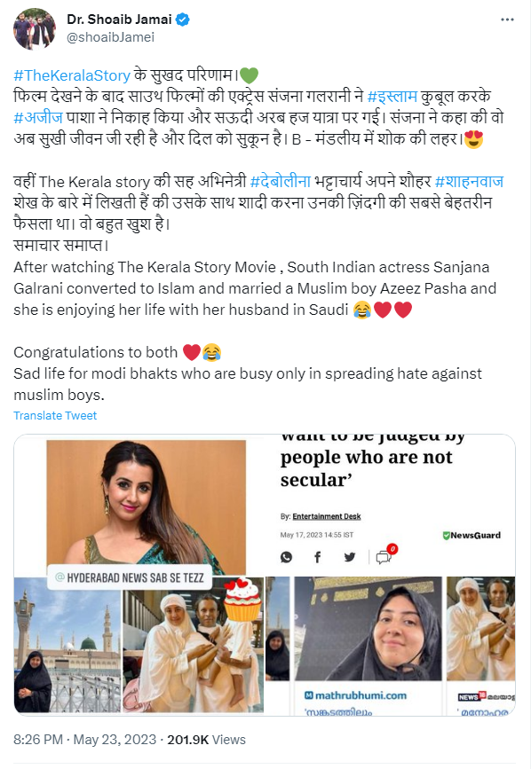 اس طرح نیوز چیکر کی تحقیقات سے یہ ثابت ہوا کہ جنوبی بھارت کی اداکارہ سنجنا گلرانی نے فلم دی کیرلہ اسٹوری دیکھنے کے بعد اس ہفتے اسلام قبول نہیں کیا ہے، بلکہ 2018 میں ہی وہ اسلام قبول کر چکی تھیں۔ البتہ گزشتہ دنوں اہل خانہ کے ساتھ عمرہ کرنے سعودی عرب گئیں تھیں۔