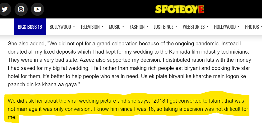مزید سرچ کے دوران ہمیں اداکارہ سنجنا کا ایک خصوصی انٹرویو اسپاٹ بوائے نیوز ویب سائٹ پر ملا۔ جسے یکم جولائی 2021 کو شائع کیا گیا تھا۔ اس رپورٹ میں بھی واضح کیا گیا ہے کہ سنجنا گلرانی نے 2018 میں ہی اسلام قبول کرلیا تھا۔