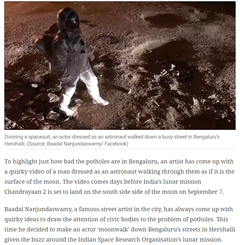 مزید سرچ کے دوران کئی میڈیا رپورٹس ملیں۔ جن میں وائرل ویڈیو کی تفصیلات دی گئی ہے۔ نو بھارت ٹائمس اور انڈین ایکسپریس کے مطابق ویڈیو کرناٹک کی راجدھانی بنگلورو کے یشونت پور اسمبلی حلقہ کے ہیروہلی کی ہے۔ جہاں مشہور آرٹسٹ بادل ننجنداسوامی نے اپنے آرٹ ورک کے ذریعے عوام کو چونکا دیا تھا۔ جس میں انہوں نے خلاء باز کا لباس پہن کر بنگلورو میں سڑکوں کی بدحالی دکھانے کی کوشش کی تھی۔