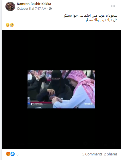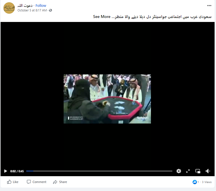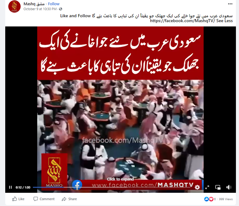 یوٹیوب اور فیس بک پر تاش کھیلنے کا ایک ویڈیو شیئر کیا جا رہا ہے۔ جس میں عرب کے روایتی لباس میں مرد و خواتین تاش کھیلتے ہوئے نظر آرہے ہیں۔ صارفین کا دعویٰ ہے کہ “سعودی عرب میں اجتماعی جوا خانے کا دل دہلا دینے والا منظر”۔