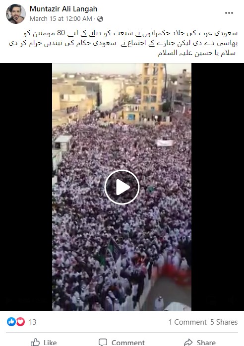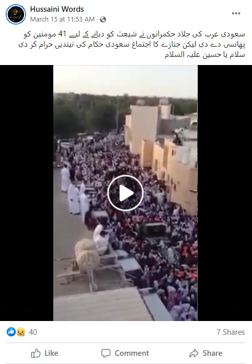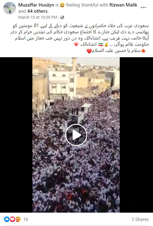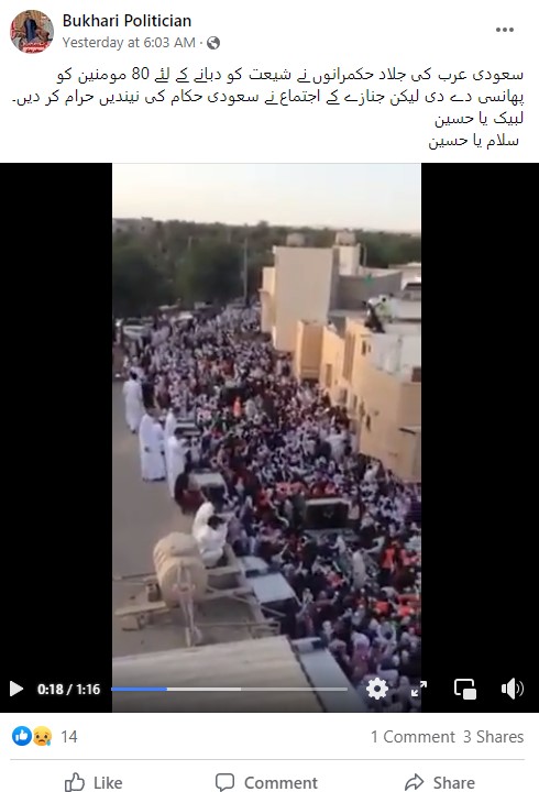 فیس بک پر مذکورہ وائرل ویڈیو کے کیپشن میں ایک صارف نے لکھا ہے کہ سعودی عرب کی جلاد حکمرانوں نے شیعت کو دبانے کے لیے 41 مؤمنین کو پھانسی دے دی، لیکن جنازے کے اجتماع نے سعودی حکام کی نیندیں حرام کر دیں، سلام یا حسین علیہ السلام۔ اسی طرح کچھ صارفین 81 افراد تو کچھ نے80 افراد کے نماز جنازہ کا بتاکر ویڈیو شیئر کیا ہے۔