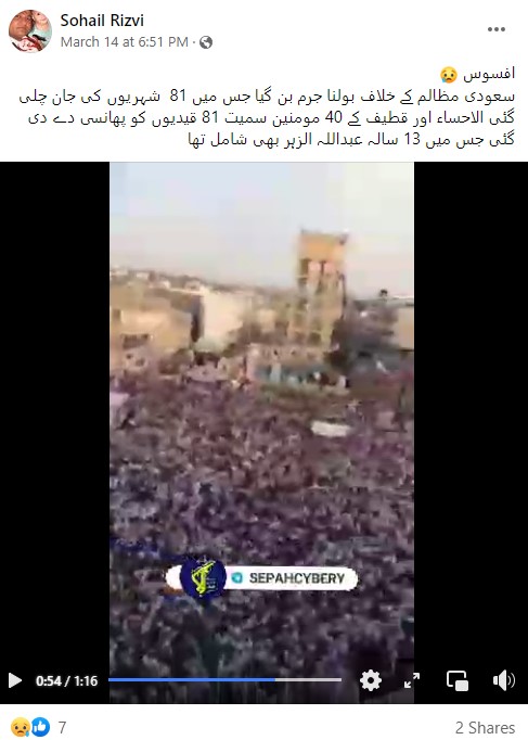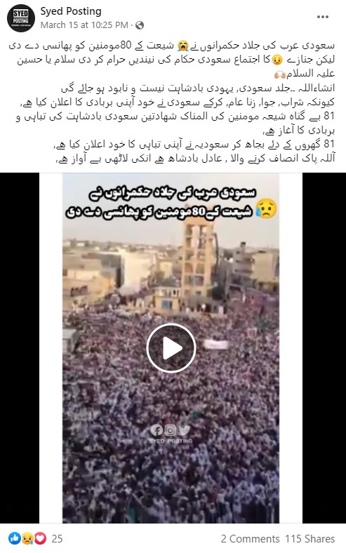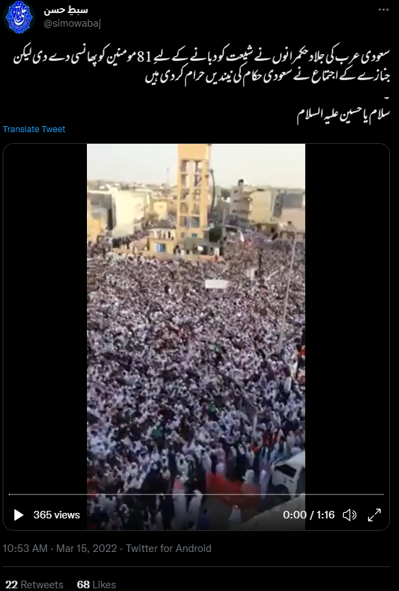 نماز جنازہ والی ویڈیو کے کیپشن میں ایک دوسرے ٹویٹر صارف نے کیپشن میں لکھا ہے کہ “سعودی عرب کی جلاد حکمرانوں نے شیعت کو دبانے کے لئے 81 مؤمنین کو پھانسی دے دی، لیکن جنازے کے اجتماع نے سعودی حکام کی نیندیں حرام کر دی ہیں”۔