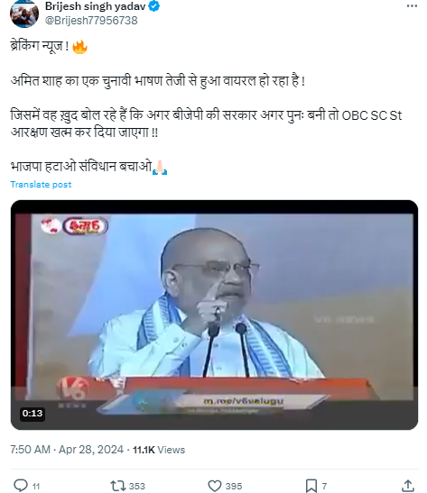 سوشل نٹورکنگ سائٹس ایکس، فیس بک اور واہٹس ایپ پرایک ویڈیو کے ساتھ دعویٰ کیا جا رہا ہے کہ امت شاہ نے اپنے بیان میں کہا ہے کہ اگر بی جے پی کی حکومت بنےگی تو ایس سی-ایس ٹی اور او بی سی کا ریزرویشن ختم کر دیا جائے گا۔