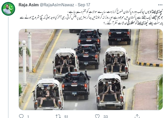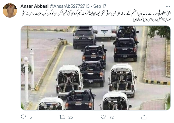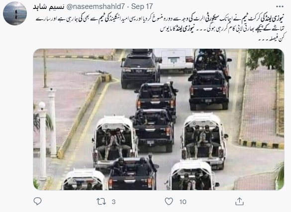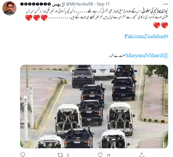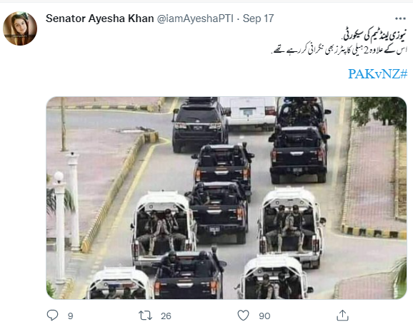 سوشل میڈیا پر سیکورٹی گاڑیوں کی ایک تصویر خوب گشت کر رہی ہے۔ صارفین کا دعویٰ ہے کہ “پاکستان میں نیوزی لینڈ ٹیم کی سیکورٹی کی تصویر ہے، یہ بھی دعویٰ ہے کہ 2 ہیلی کاپٹر بھی ٹیم کی نگرانی کر رہے تھے۔ لیکن ان لوگوں کو یہ عزت راس نہ آئی اور اپنا اصل چہرہ دنیا کو دکھا دیا”۔