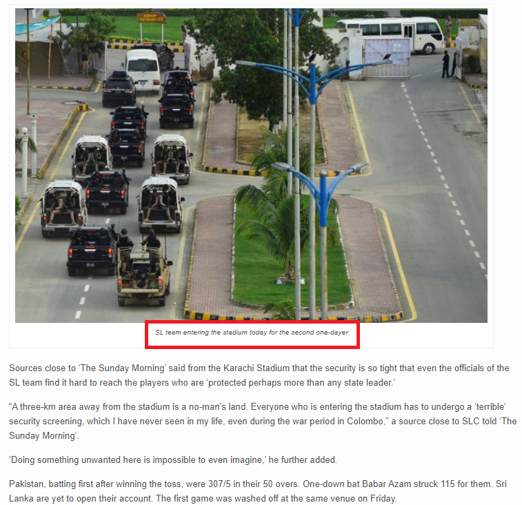 دی مارننگ نامی ویب سائٹ پر 30 ستمبر 2019 کی ایک رپورٹ ملی۔ جس میں وائرل تصویر کے بارے واضح طور پر لکھا ہے کہ “سری لنکا کی کرکٹ ٹیم کراچی انٹرنیشل اسٹیڈیم میں سخت سیکورٹ کے ساتھ داخل ہورہی ہے” جس کی یہ تصویر ہے۔