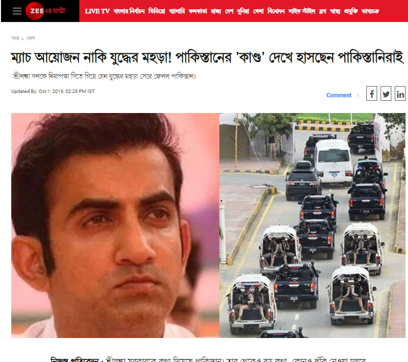 پاکستان میں نیوزی لینڈ ٹیم کی سیکورٹی کے حوالے سے وائرل تصویر کی سچائی جاننے کے لئے ہم نے اپنی تحقیقات کا آغاز کیا۔ سب سے پہلے تصویر کو ہم نے گوگل ریورس امیج سرچ کیا۔ جہاں ہمیں زی نیوز کی ویب سائٹ پر 1 اکتوبر 2019 کی ایک رپورٹ بنگلہ زبان میں ملی۔ جس میں بھارتی کرکٹر و بی جے پی لیڈر گوتم گمبھیر کی تصویر اور وائرل تصویر سے ملتی جلتی تصویر کے ساتھ خبر ملی۔ لیکن یہ تصویر کہاں کی ہے یہ پتا نہ چل سکا؟