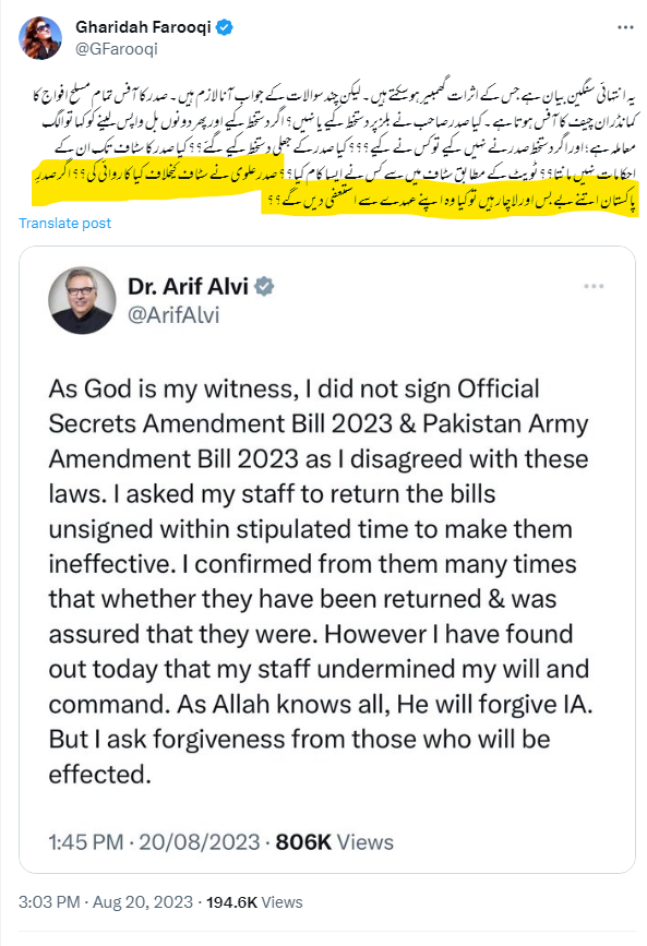 Tweet by Gharidah Farooqi on 20 Aug 2023
