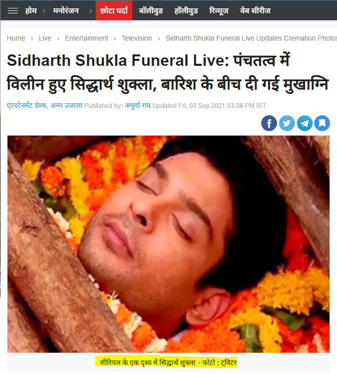 پھر ہم نے کچھ کیورڈ سرچ کیا۔ اس دوران ہمیں امر اجالا پر شائع 3 ستمبر 2021 کی ایک خبر ملی۔ جس میں وائرل تصویر کو سیریل کا ایک منظر کا بتایا گیا ہے۔ اس رپورٹ سے پتا چلا کہ وائرل تصویر سدھارتھ شکلا کے آخری رسومات کے دوران لی گئی تصویر نہیں ہے، بلکہ ایک سیریل میں ادا کر رہے کردار کی ہے۔